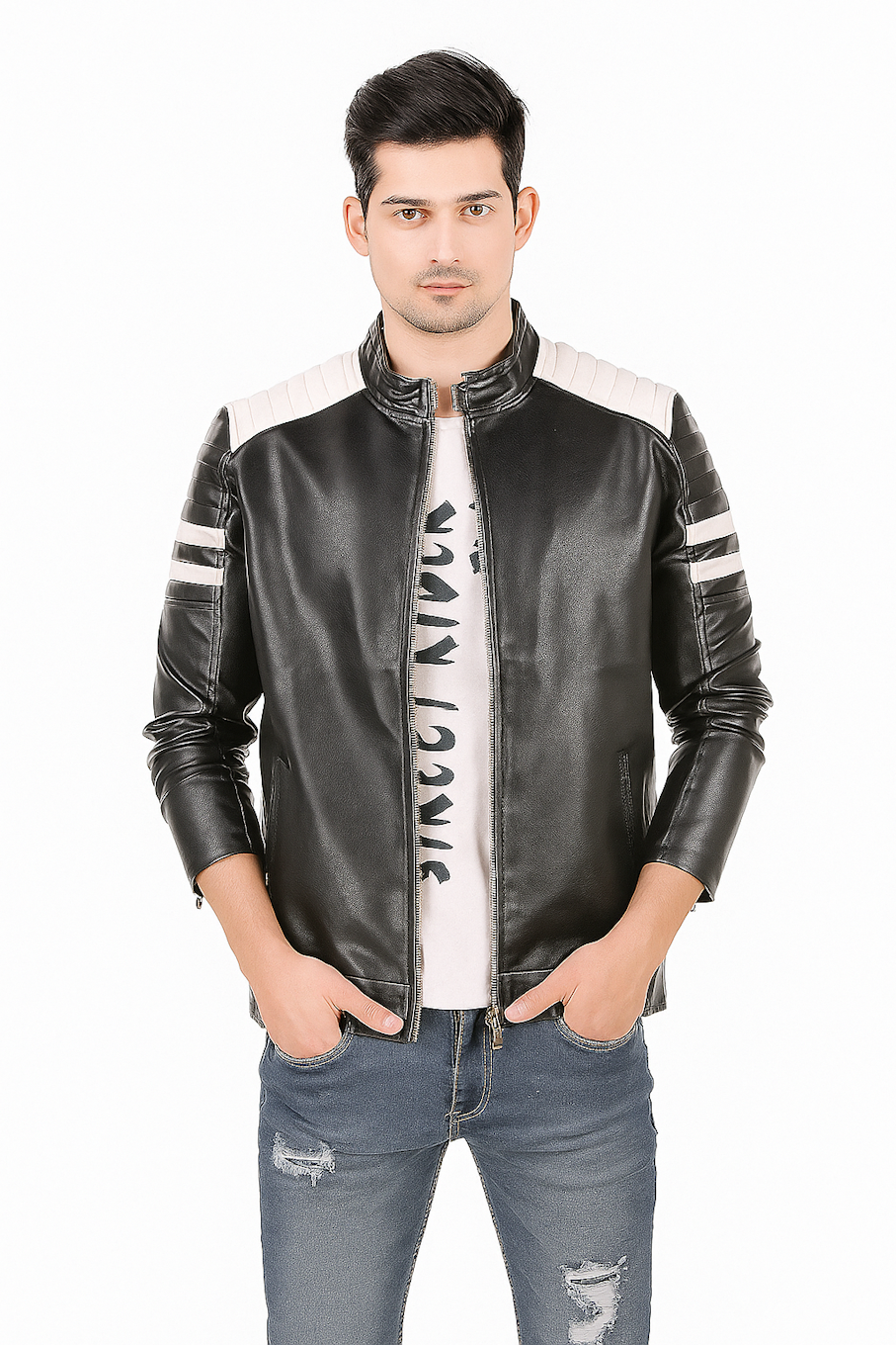 Stylish men’s leather jacket crafted from premium quality faux leather, featuring a sleek front zipper...
