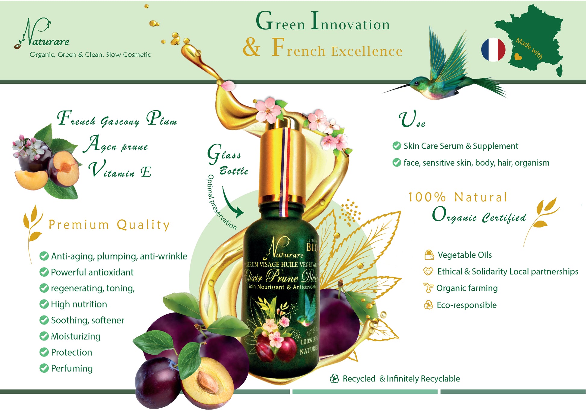 A unique oil in the world resulting from a green innovation of the circular economy, from an idea of recycling, of revalorization of the unused plum kernels in precious oil of exception.